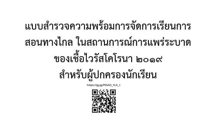 ตามที่ สํานักงานคณะกรรมการการศึกษาขั้นพื้นฐาน ได้มีมาตรการการเตรียมความพร้อม ในการ จัดการ เรียนการสอนออนไลน์ ในภาคเรียนที่ 1 ปีการศึกษา 2563 ในสถานการณ์การแพร่ระบาดของเชื้อไวรัสโคโร นา 2019 (COVID-19) ประจําปีการศึกษา 2563 จึงได้จัดทําแบบสํารวจความพร้อมการจัดการเรียนการสอน ทางไกล ในสถานการณ์การแพร่ระบาดของเชื้อไวรัสโคโรนา 2019 (COVID-19) สําหรับผู้ปกครองนักเรียน ปี การศึกษา 2563 โดยมีรายละเอียดดังนี้ 1. มอบหมายให้โรงเรียนดําเนินการ ส่งแบบสํารวจและกํากับ ติดตาม การกรอกข้อมูลให้ครบถ้วน ตามเวลาที่กําหนด 2. โรงเรียน มอบหมายให้ครู สํารวจข้อมูลผู้ปกครองนักเรียน โดยกรอกข้อมูลออนไลน์ในที่อยู่ (ลิงค์) ที่สํานักงานเขตพื้นที่การศึกษาส่งให้ 3. กําหนดการกรอกข้อมูลให้แล้วเสร็จภายใน วันที่ 30 มีนาคม 2563 4. โดยนําที่อยู่ที่ปรากฏในลิงค์ด้านล่าง หรือ สแกน QR-CODE เพื่อรายงานข้อมูล