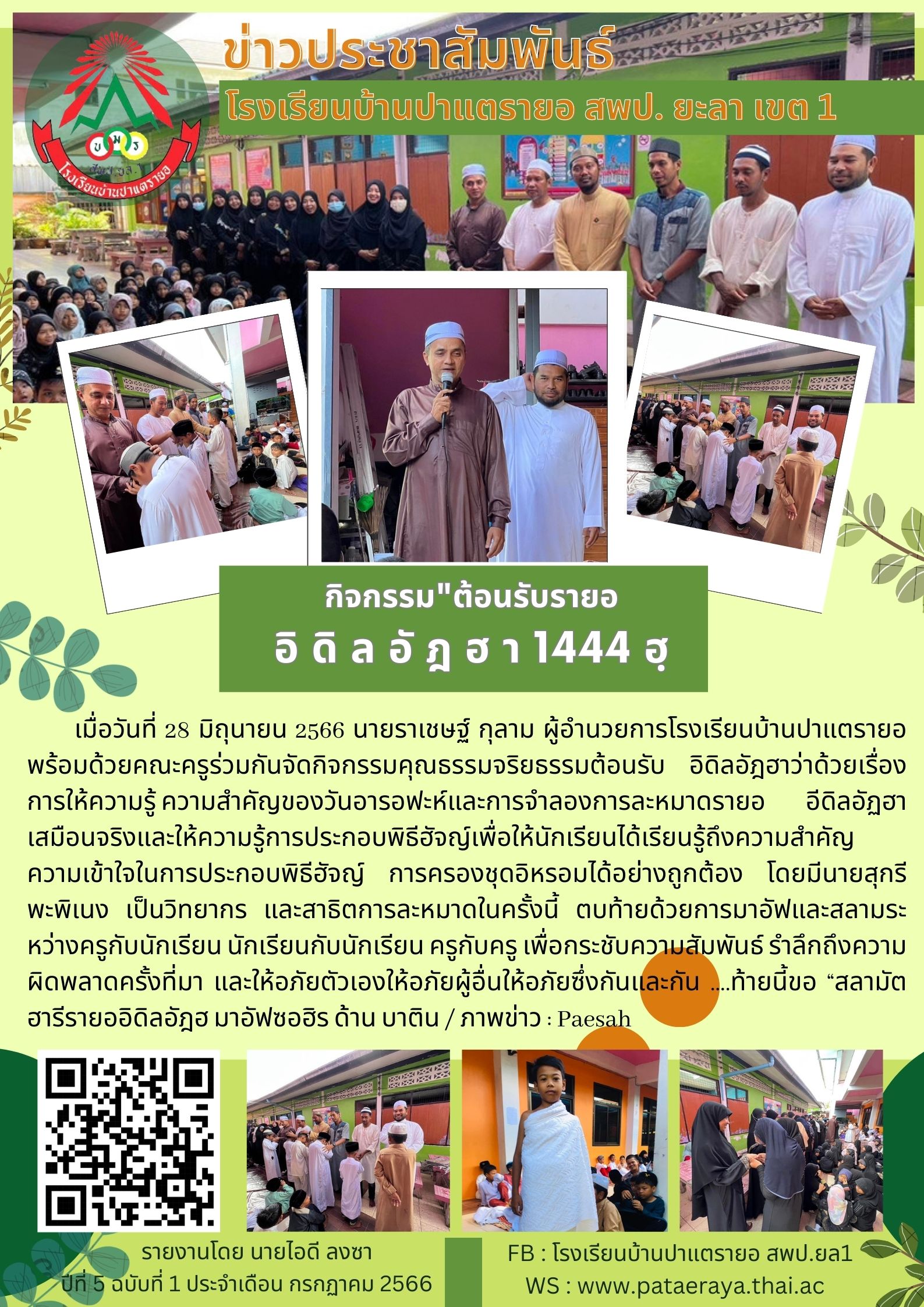 วันนี้ 28 มิถุนายน 2566 นายราเชษฐ์ กุลาม ผู้อำนวยการโรงเรียนบ้านปาแตรายอ พร้อมด้วยคณะครู ร่วมกันจัดกิจกรรมคุณธรรมจริยธรรมต้อนรับอิดิลอัฎฮา ว่าด้วยเรื่องการให้ความรู้ ความสำคัญของวันอารอฟะห์และการจำลองการละหมาดรายออีดิลอัฏฮา เสมือนจริง และให้ความรู้การประกอบพิธีฮัจญ์ เพื่อให้นักเรียนได้เรียนรู้ถึงความสำคัญ ความเข้าใจในการประกอบพิธีฮัจญ์ การครองชุดอิหรอมได้อย่างถูกต้อง โดยมีนายสุกรี พะพิเนง เป็นวิทยากร และสาธิตการละหมาดในครั้งนี้ ตบท้ายด้วยการมาอัฟและสลามระหว่างครูกับนักเรียน นักเรียนกับนักเรียน ครูกับครู เพื่อกระชับความสัมพันธ์ รำลึกถึงความผิดพลาดครั้งที่มา และให้อภัยตัวเองให้อภัยผู้อื่นให้อภัยซึ่งกันและกัน ….ท้ายนี้ขอ “สลามัตฮารีรายออิดิลอัฎฮ มาอัฟซอฮิร ด้าน บาติน